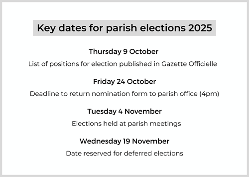 By law, the parish Constables are responsible for the day-to-day administration of the parish, assisted by a small team of parish staff, while the Douzeniers are representatives of the parishioners and are responsible for the vision and direction of the parish and the transparency of its affairs.