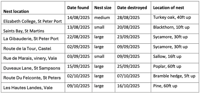 "To summarise the year, we are relieved to say that after very high numbers of queens caught in the spring, a total number of eight large nests were found this year – the average from 2019-25 is six nests/year. Compared to other regions (e.g., Jersey have already reported finding over 550 nests), the situation in Guernsey appears to remain under control. Annual eradication continues to be an achievable goal and there is no evidence that this invasive pest is established on our island."